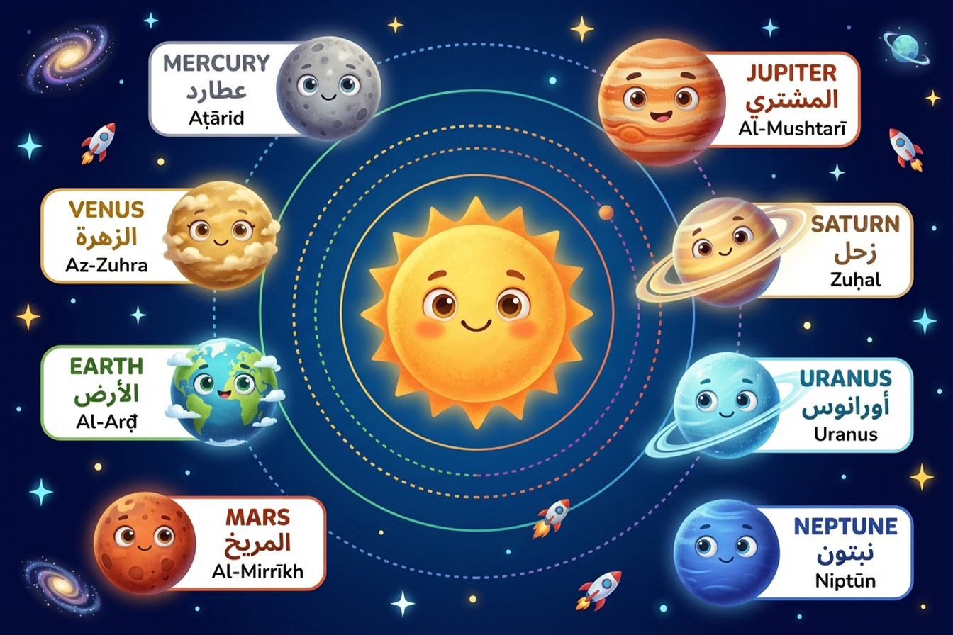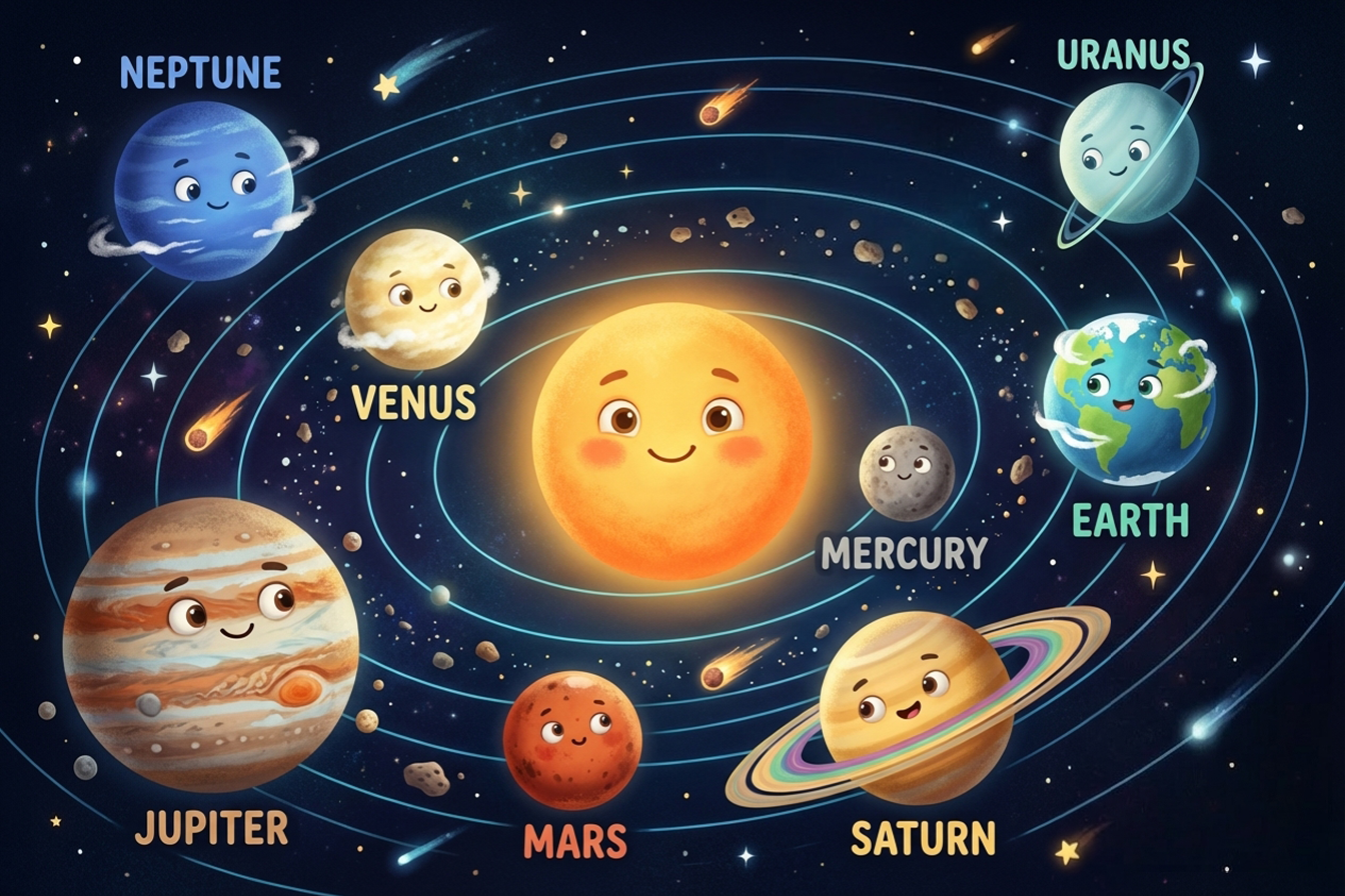 يمكن للأطفال تعلّم اسماء الكواكب بالانجليزي بسهولة باستخدام طرق بسيطة للمساعدة على التذكّر. فالأساليب التعليمية الممتعة مثل الجمل القصيرة أو الألعاب تساعد الأطفال على حفظ ترتيب الكواكب بسرعة وفهمها بشكل أفضل أثناء الدراسة أو القراءة عن الفضاء.