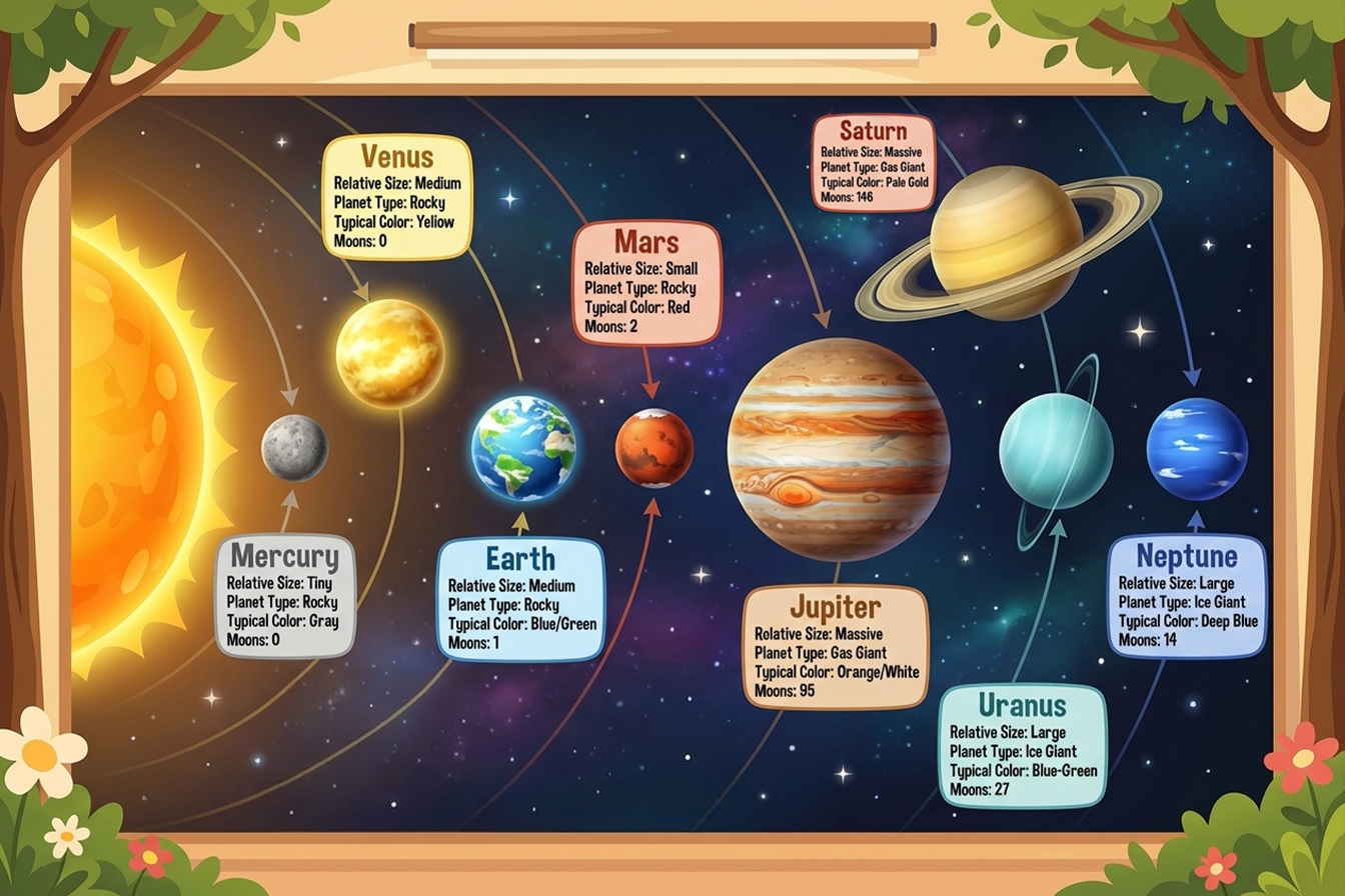 - كل كوكب له خصائص فريدة مثل الحجم، الغلاف الجوي، الأقمار، ودرجة الحرارة.