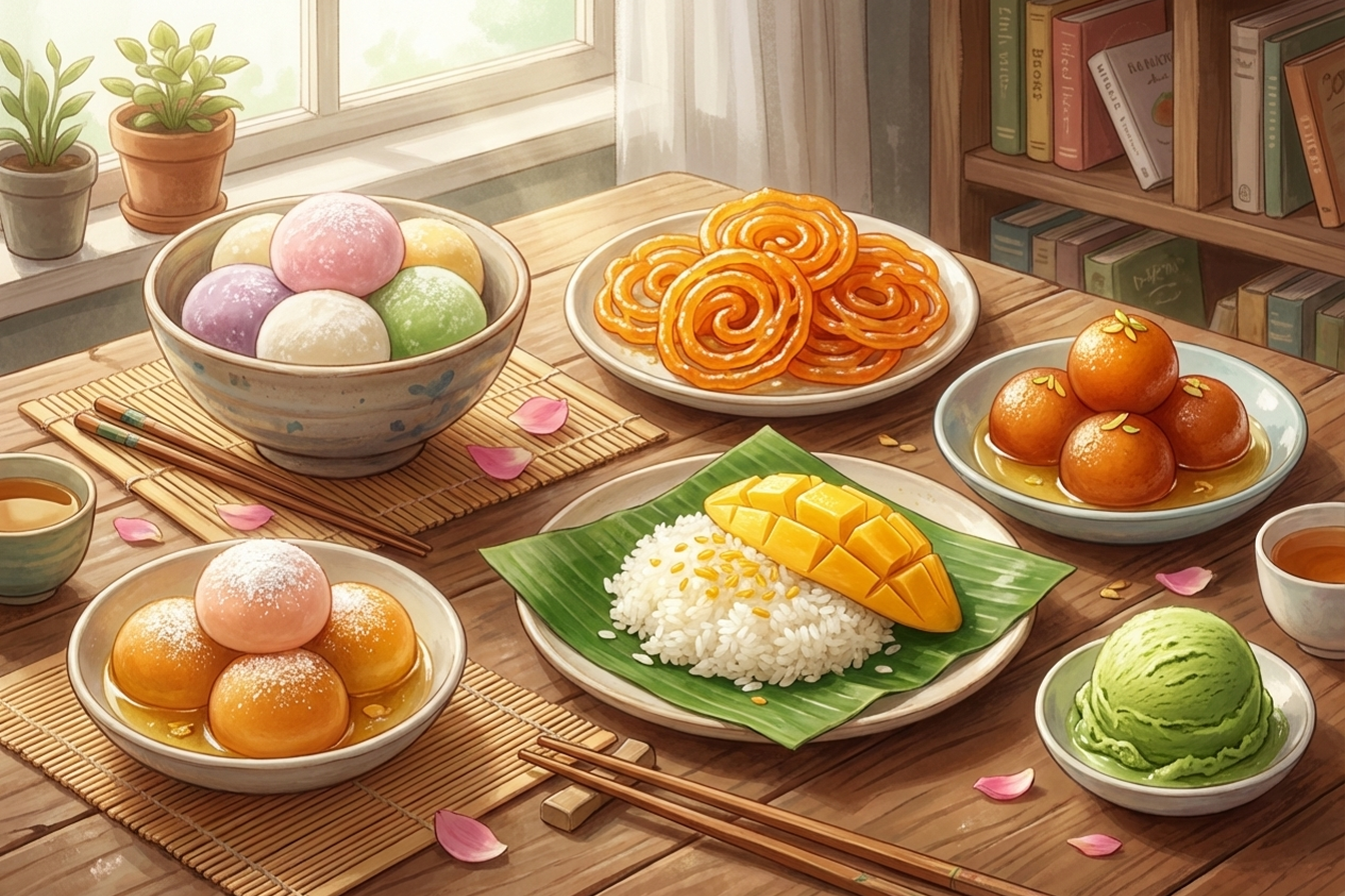 - الحلويات الآسيوية تعتمد على الأرز والحليب والفواكه مثل الموتشي والجلاب جامون.