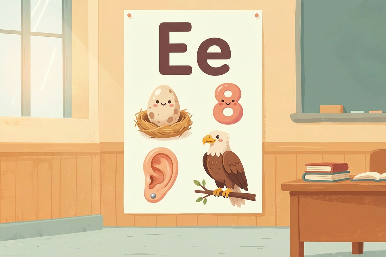 الحرف e هو الحرف الخامس في الأبجدية الإنجليزية، ويظهر في كثير من الكلمات السهلة والمفيدة والممتعة التي يستطيع الأطفال تذكّرها بسرعة.
