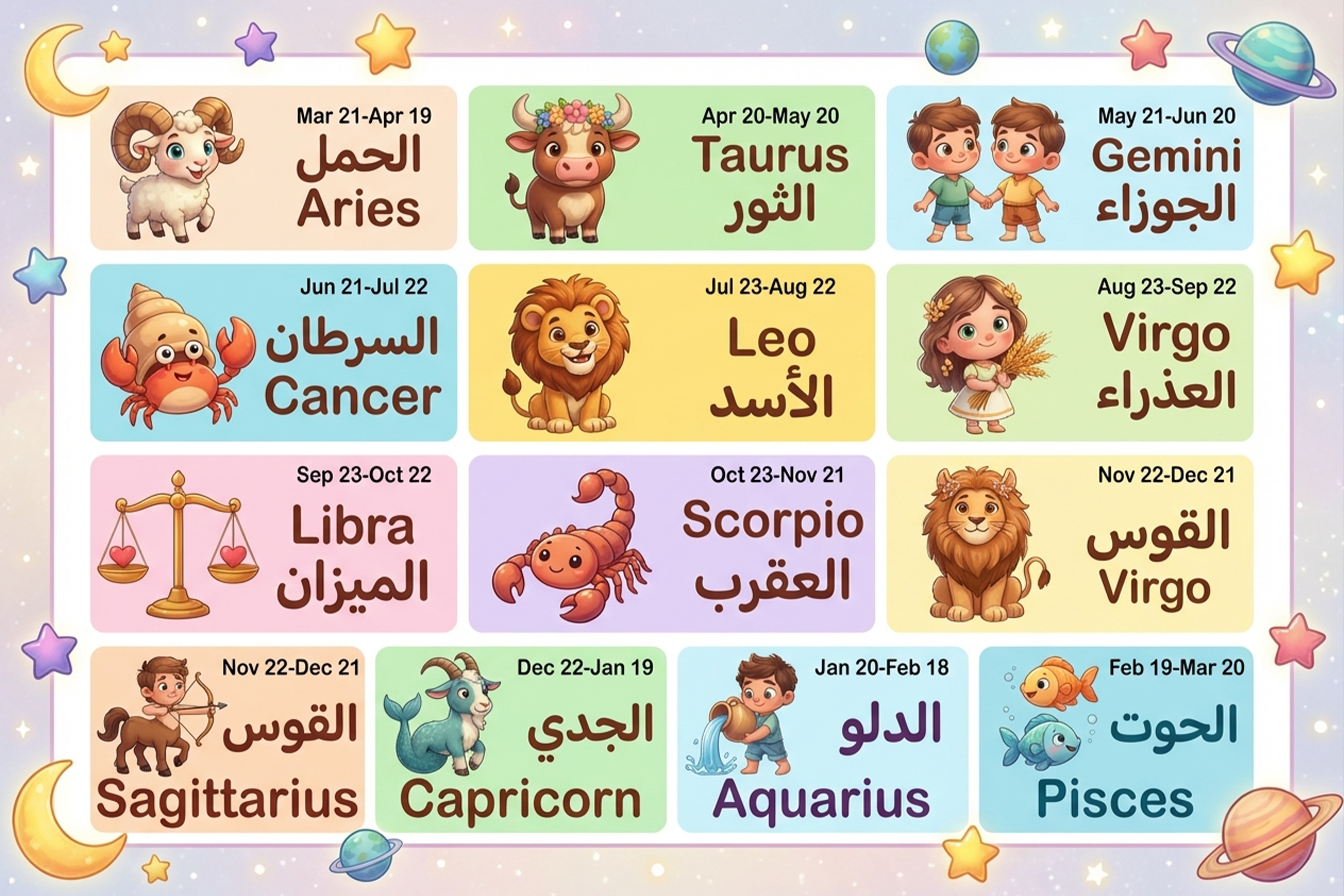الأبراج الاثني عشر باللغة الإنجليزية مع الترجمة العربية