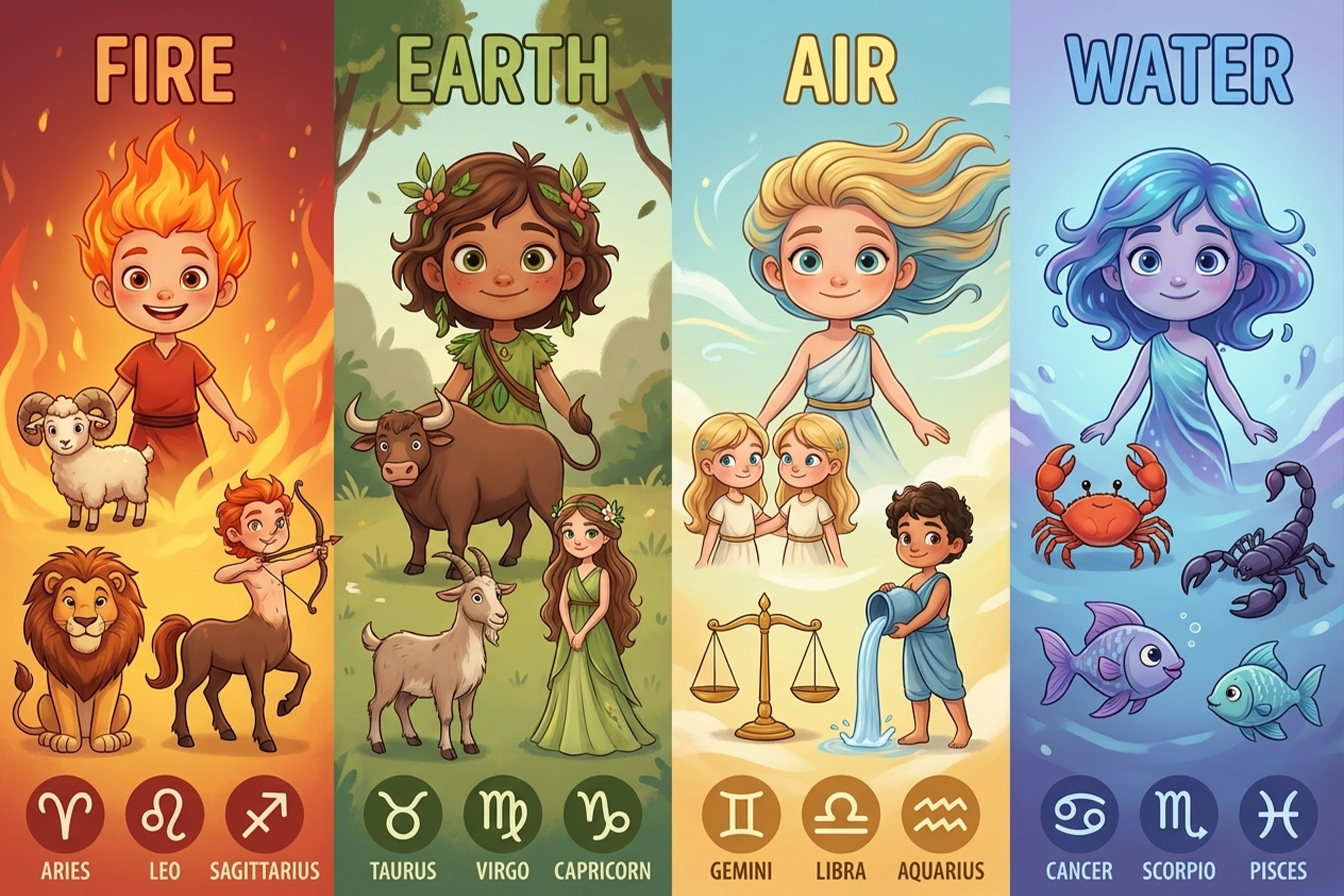 في علم التنجيم، تُصنَّف الأبراج إلى أربعة عناصر طبيعية تؤثر على صفات الشخصية.