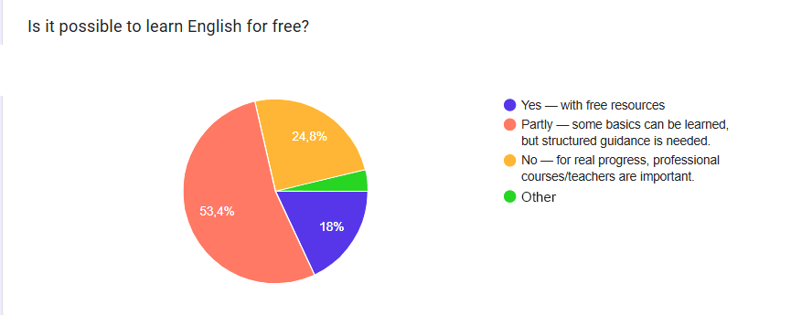 A very similar question is whether it’s possible to learn English for free. We asked NovaKid English teachers, and their answers were quite clear. More than half said that no, you can’t really learn English without investing in a structured learning path, while many others believe it’s only partially possible. Overall, nearly 80% of teachers agree that free resources may help learners pick up the basics, but real progress is unlikely.