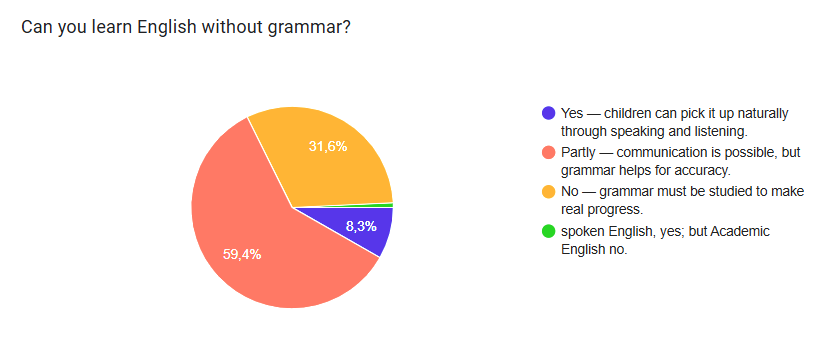 Another key topic is grammar. Exposure to English — through videos, apps, or even ChatGPT — definitely helps learners become familiar with the language. But on its own, it’s not enough, especially if you don’t live in an English-speaking country. To make real progress, learners also need structured grammar practice: over 90% of the teachers in our survey believe that English can’t be learned without grammar.