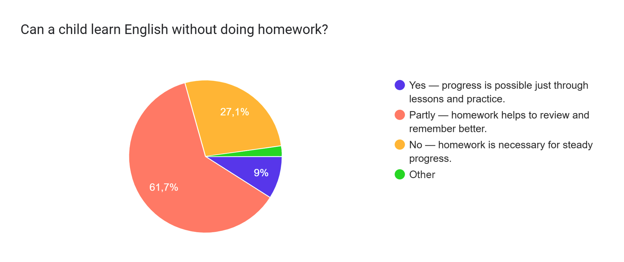And after grammar comes homework. According to the survey, around 90% of teachers consider homework essential for learning. For 61.7%, progress without homework is only partial, while nearly 30% believe real progress isn’t possible at all without it.