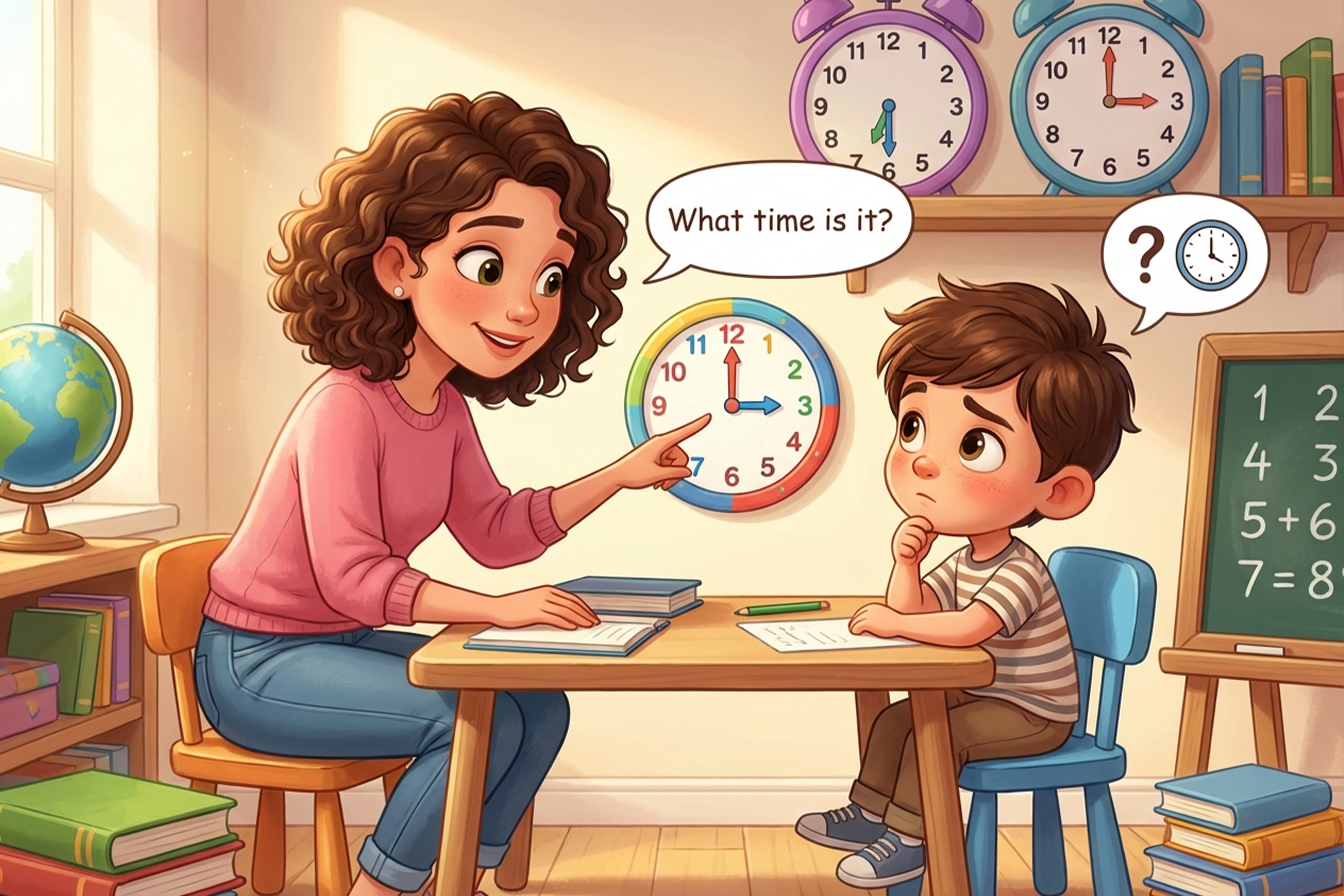 Děti se mohou hodiny anglicky učit například pomocí papírových hodin, jednoduchých her nebo otázek o denním režimu. Velmi dobře fungují otázky jako “What time do you go to school?” nebo “What time do you go to bed?”, které spojují čas s běžnými aktivitami během dne.