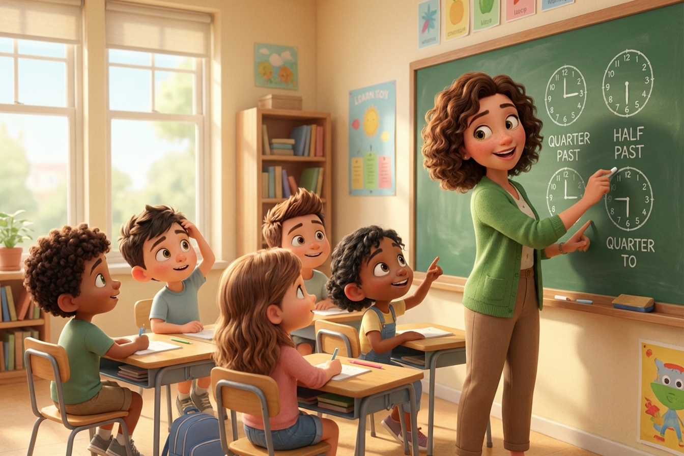 Jakmile děti zvládnou celé hodiny, mohou se naučit i další výrazy. Half past znamená půl hodiny po celé hodině, například half past three (půl čtvrté). Pro čtvrt hodiny se používají výrazy quarter past a quarter to. Quarter past five znamená čtvrt na šest, zatímco quarter to six znamená tři čtvrtě na šest. Tyto výrazy patří mezi základní principy, které se používají při výuce anglických hodin.