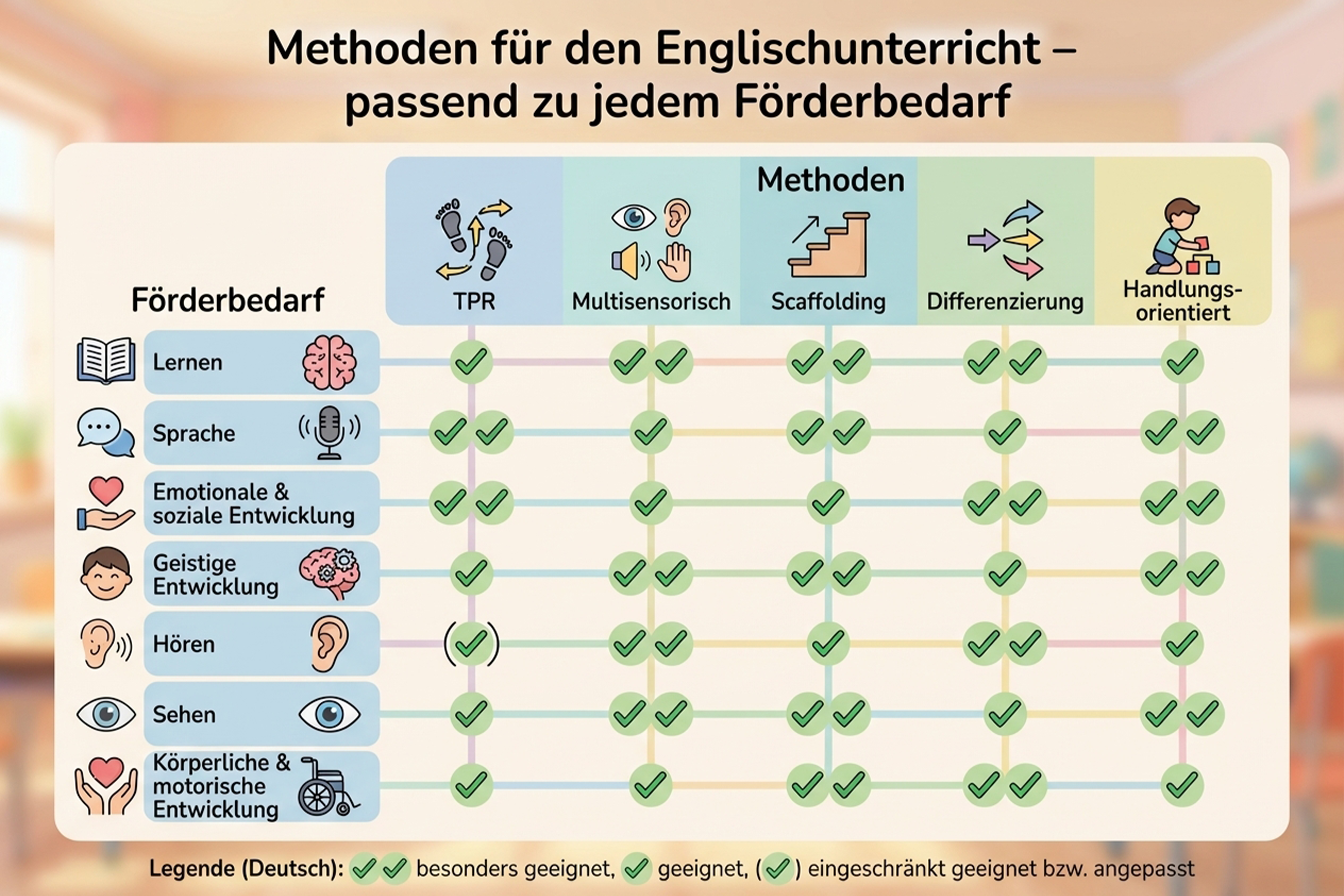 Die folgende Übersicht zeigt, welche Unterrichtsmethoden sich besonders gut für die verschiedenen Förderschwerpunkte eignen. Sie dient als Orientierung, um den Englischunterricht individuell auf die Bedürfnisse Ihres Kindes abzustimmen.