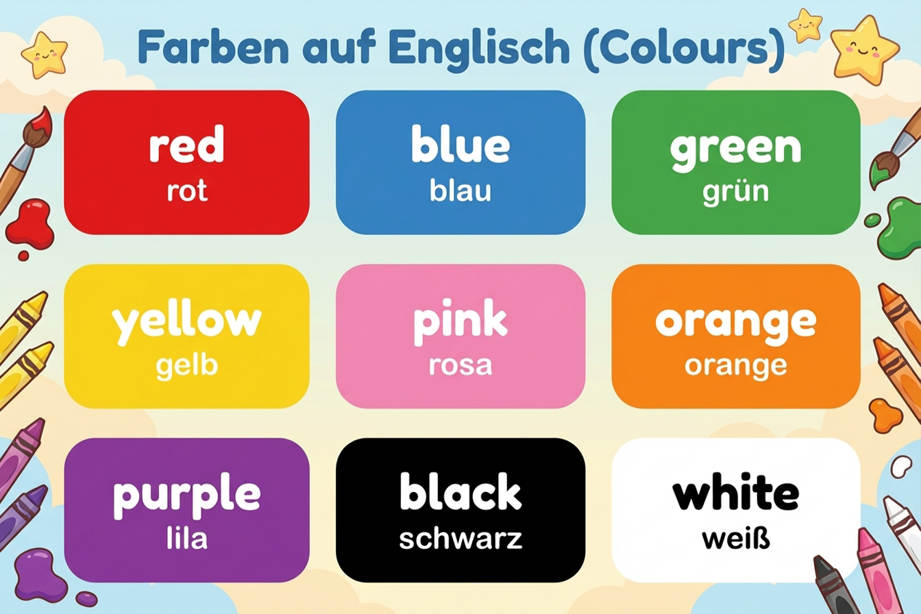 Einen umfassenden Überblick über die Farben auf Englisch – von Grundfarben bis Neonfarben – finden Sie hier: Farben auf Englisch für Kinder – spielerisch lernen mit Beispielen & Malvorlage.