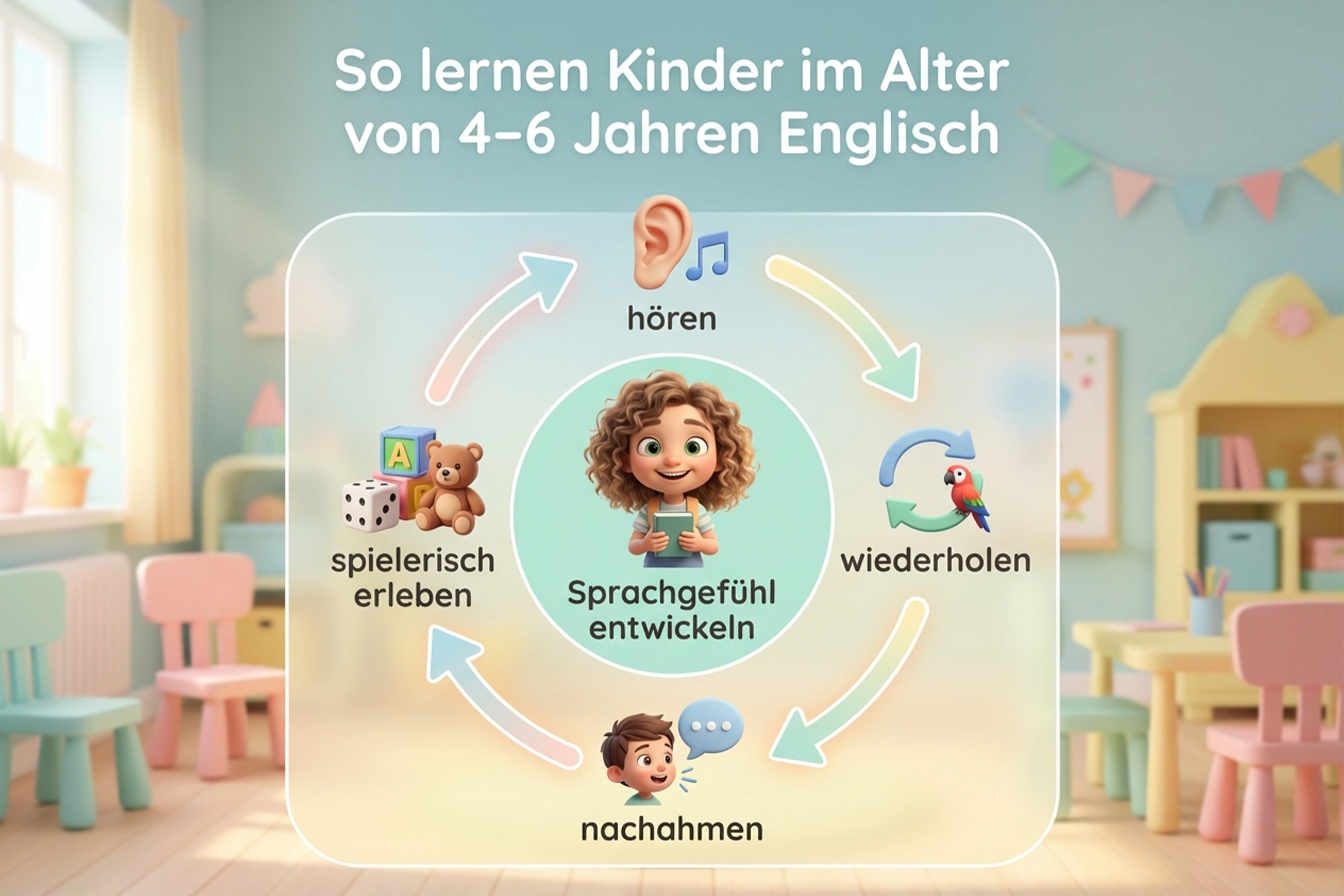 Kinder im Alter von 4 bis 6 Jahren lernen Englisch am besten spielerisch – durch Hören, Nachahmen und Erleben.