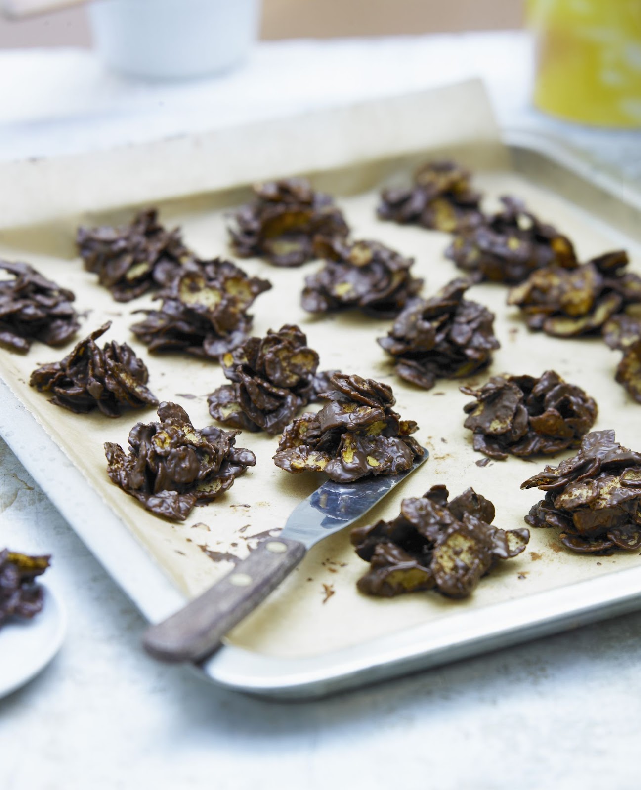 Faites fondre le chocolat avec la végétaline. Versez le mélange dans un saladier et incorporez le sucre glace, puis ajoutez-y les cornflakes. Faites des petits tas sur du papier aluminium et placez-les au réfrigérateur pendant une demi-heure. C’est prêt !