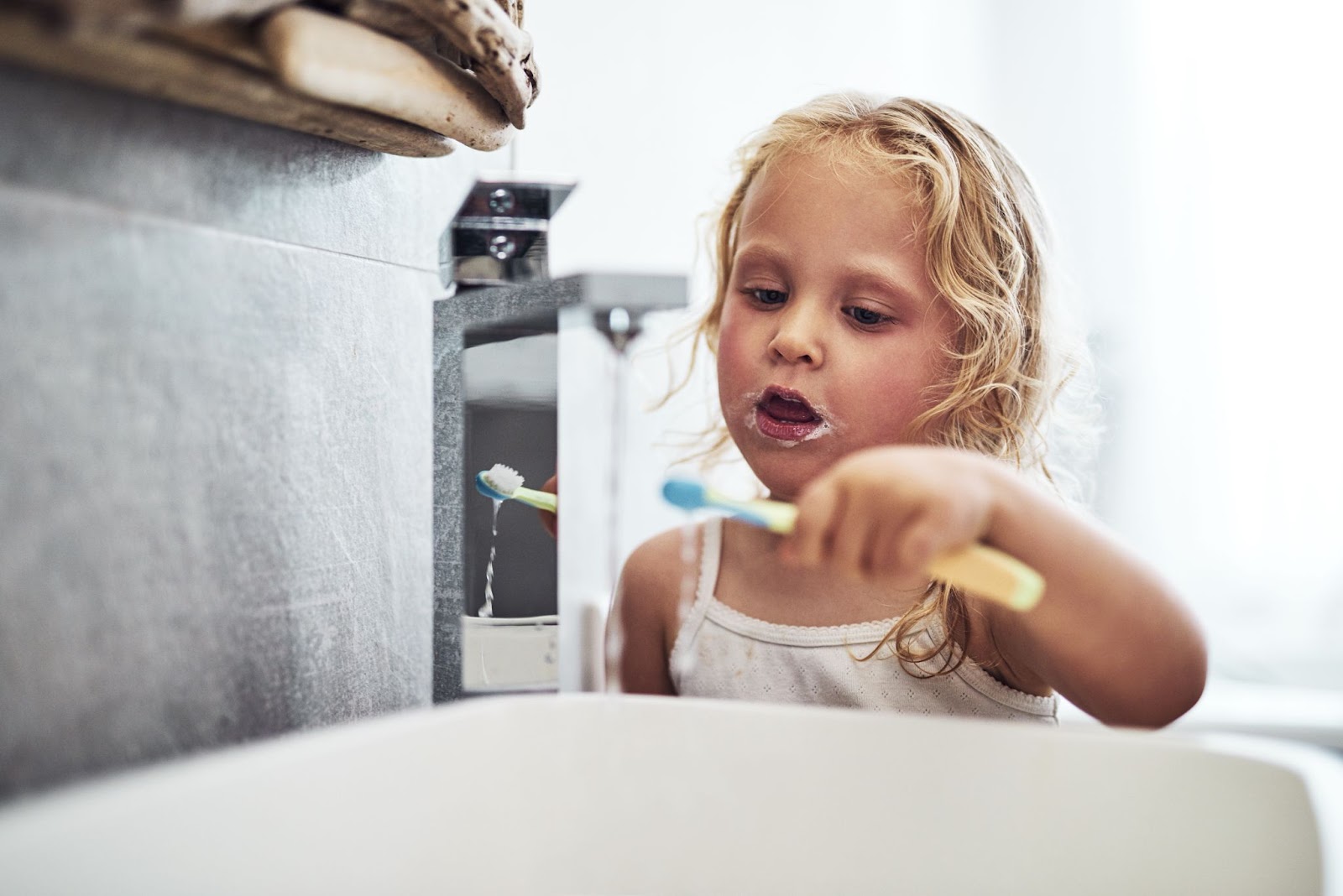 Pour encourager cette autonomie, il est important que l’enfant puisse accéder facilement au lavabo grâce à un marchepied, et qu’il ait un panier ou une trousse de toilette pour ranger ses affaires comme la brosse à dents, une brosse, un couple-ongles ainsi que les produits qui lui sont dédiés.