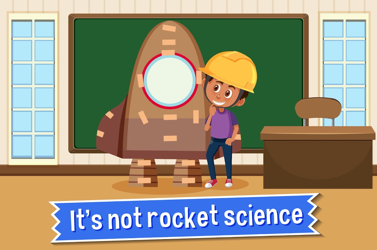 Son équivalent français est « c’est n’est pas sorcier ! », et signifie que quelque chose n’est pas compliqué ou difficile à faire ou à comprendre. L’astronautique étant considéré comme une discipline particulièrement complexe, cette locution est une exagération visant à montrer qu’il n’est pas nécessaire d’être très intelligent ou qualifié pour réaliser quelque chose. Il existe une autre expression anglaise qui possède le même sens : « it’s not brain surgery », ou, en français, ce n’est pas de la neurochirurgie.