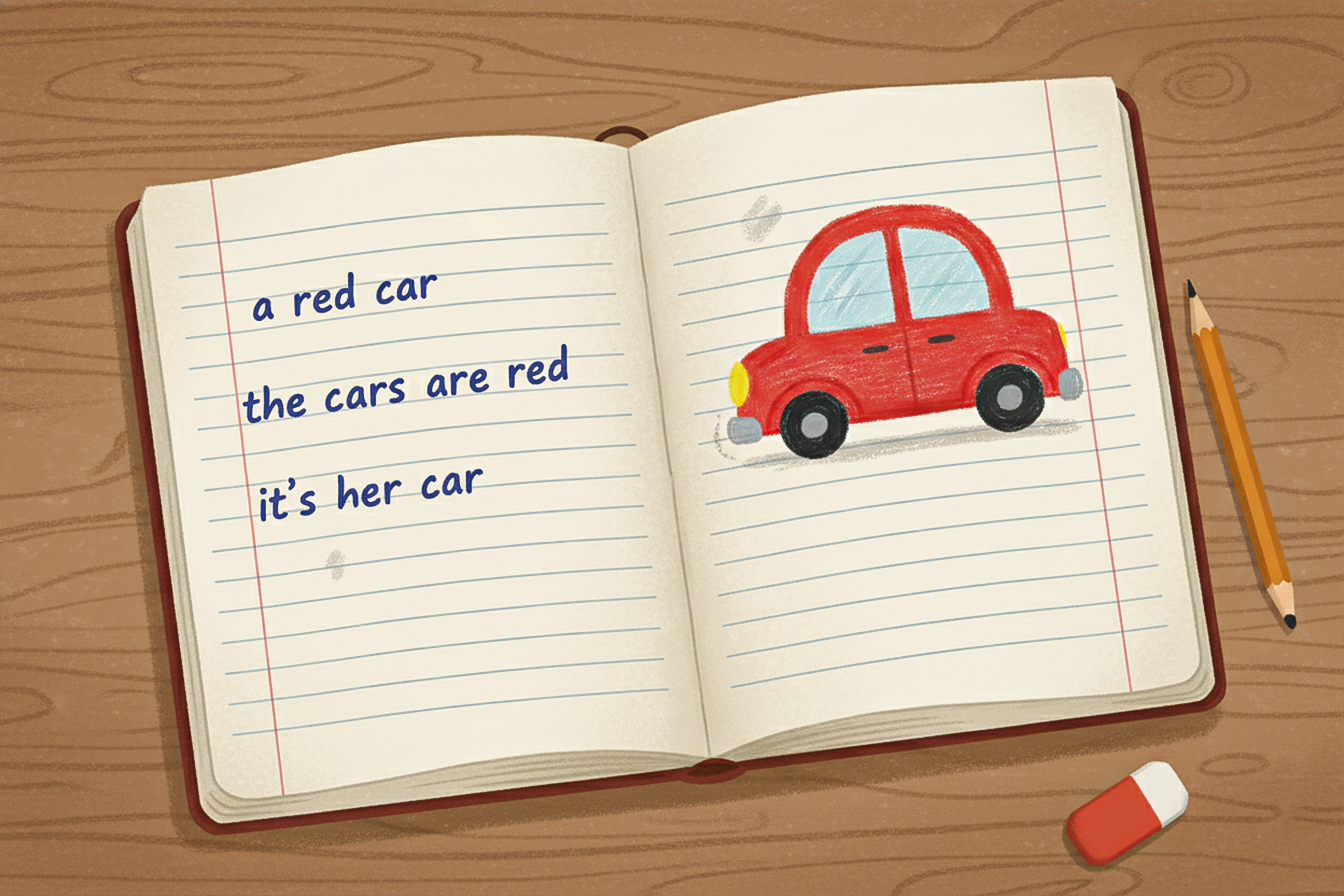 What color is the car? It is red. → « De quelle couleur est la voiture ? Elle est rouge. »