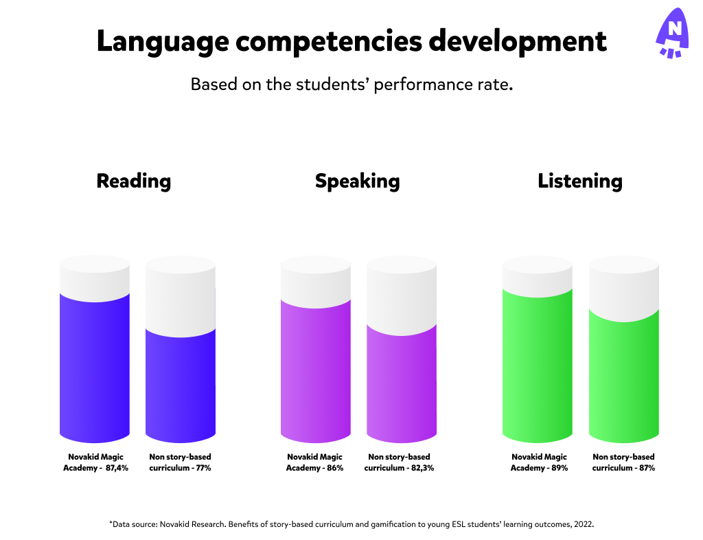Pour tester les résultats des élèves suivant ce programme, Novakid a mené une étude sur son efficacité pendant 6 mois. Les résultats démontrent une amélioration significative des performances des élèves, en matière d’expression et de compréhension orale, en lecture, ainsi qu’en termes de motivation et d’engagement. L’école de langue en ligne a publié ses résultats dans un livre blanc, que vous pouvez consulter ici. En voici un petit résumé pour comprendre ces recherches.