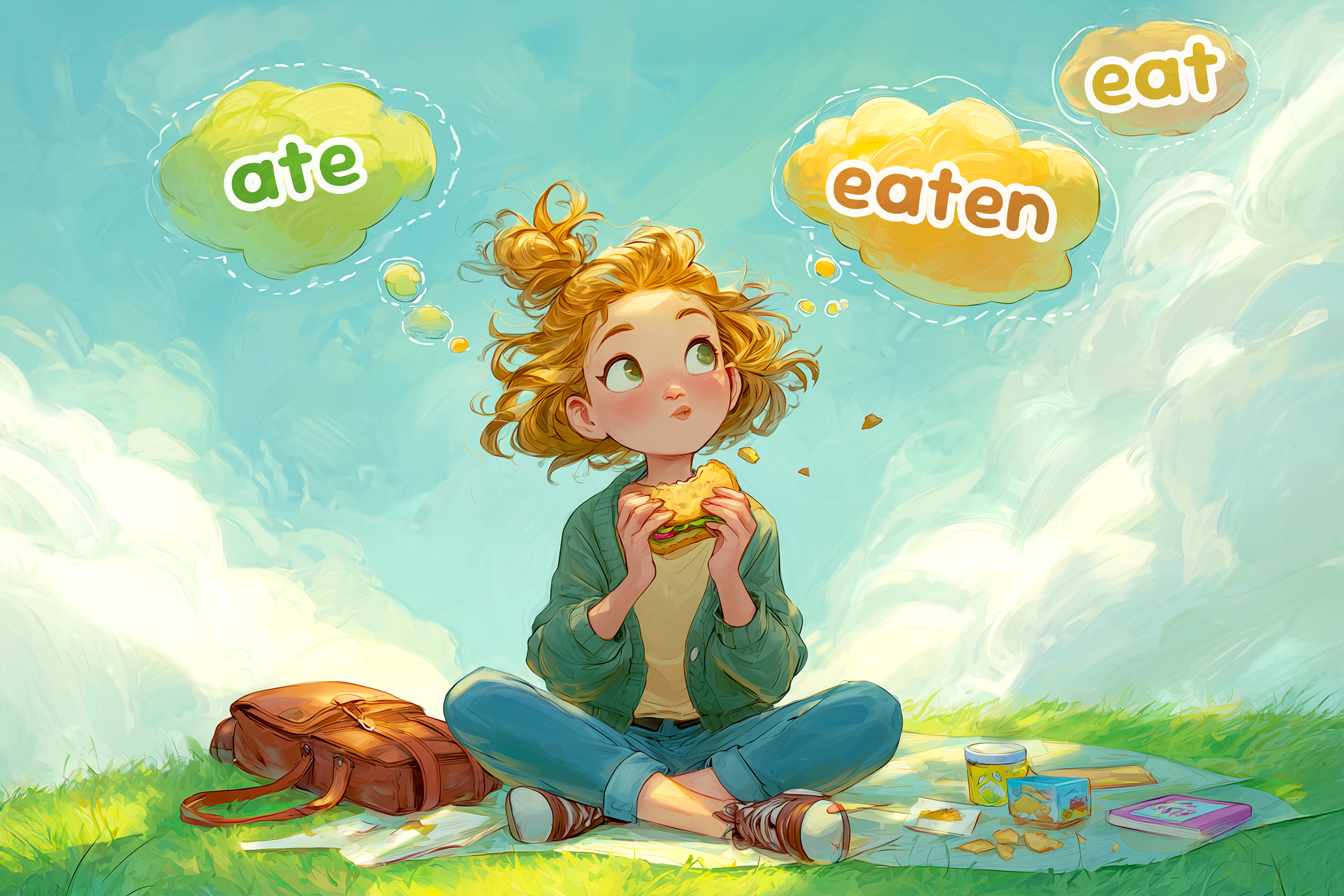 Affichez sur un mur des verbes à l’infinitif. L’animateur dit une forme conjuguée (ate), et les enfants doivent toucher le bon infinitif (eat) le plus vite possible.