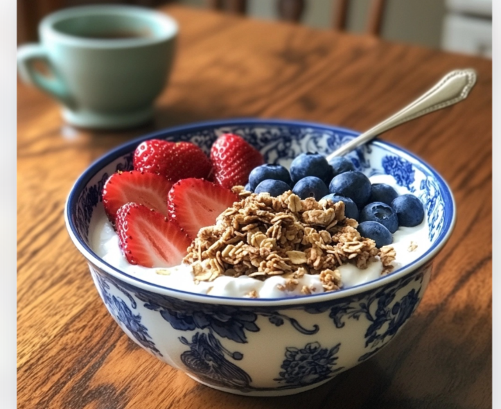 יוגורט דל שומן עם גרנולה ופירות טריים הוא ארוחה מהירה ומזינה. היוגורט מספק חלבונים ופרוביוטיקה, שתורמת לבריאות המעיים, והגרנולה מספקת פחמימות ויוצרת תחושת שובע. פירות טריים כמו תותים, פטל או מנגו, יוסיפו סוכר טבעי וויטמינים חשובים. חשוב לבחור בגרנולה עם מעט סוכר כדי שהארוחה תהיה בריאה ומזינה.