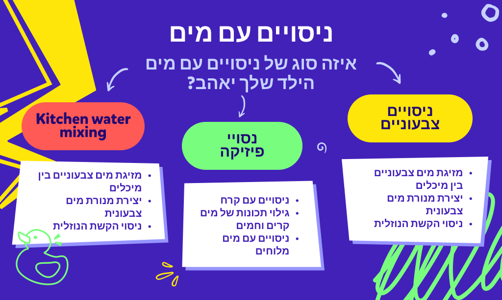 מים: חומר פשוט ויומיומי שאוגר בתוכו עולם שלם של פלא מדעי. מהטיפות שנוצרות על כוס קרה ועד לאדוות שנוצרים על ידי חלוקי נחל בבריכה או בטבע, המים מציעים שפע של הזדמנויות למוחות צעירים לחקור, ללמוד ולהדהים. העיסוק בניסויים מעשיים לא רק מטפח את הסקרנות הטבעית של הילד אלא גם מניח את הבסיס לאהבה למדע לכל החיים. באמצעות המים, משאב יסודי ונגיש בקלות, הילדים יכולים להתעמק בניסויים שהם גם מהנים וגם מלמדים.