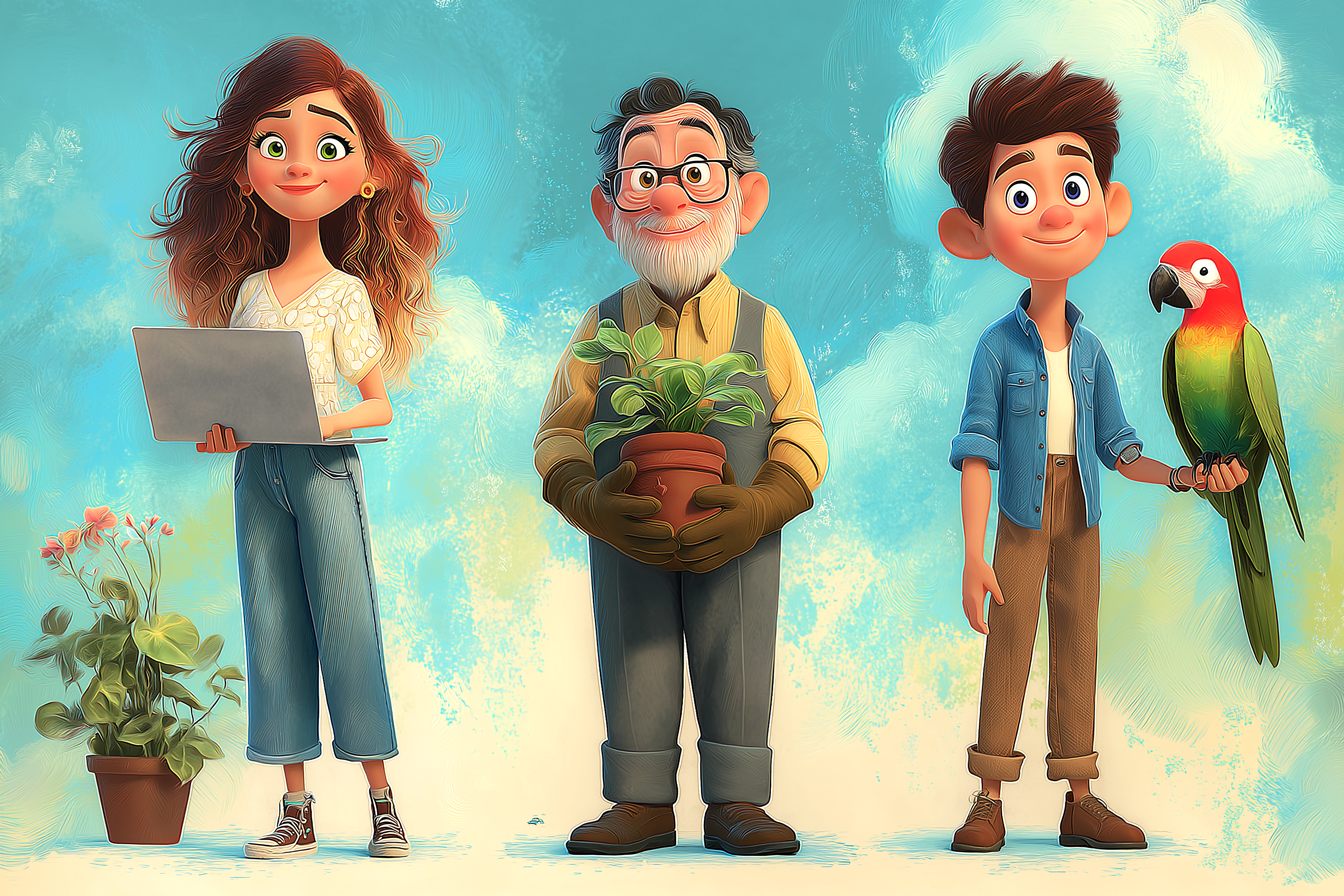 - בעלי חיים: חתול, כלב, ציפור, וכו'.
