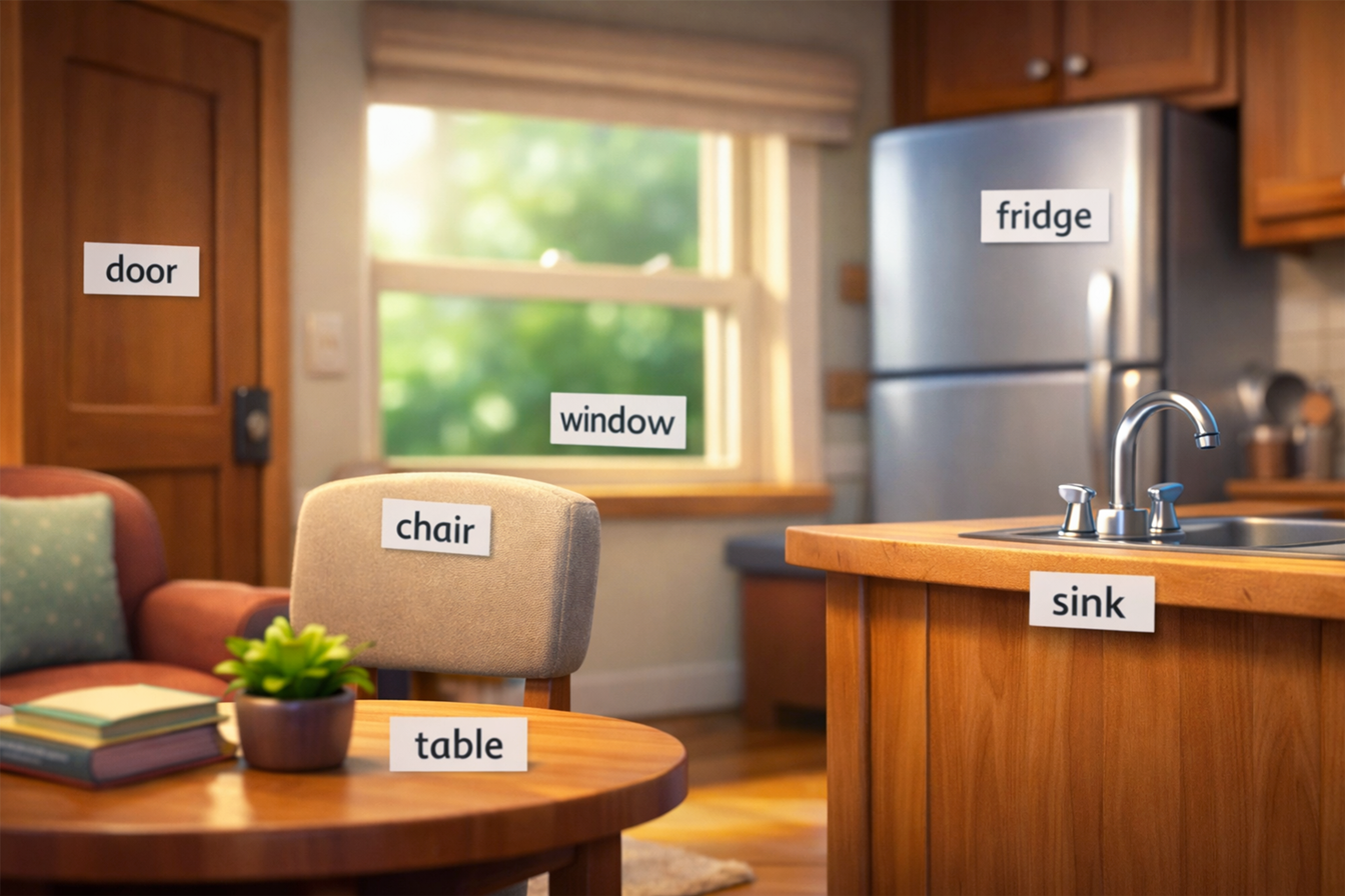 רעיון פשוט נוסף הוא להדביק תוויות קטנות באנגלית על חפצים מסוימים בבית. fridge, mirror, table, door.