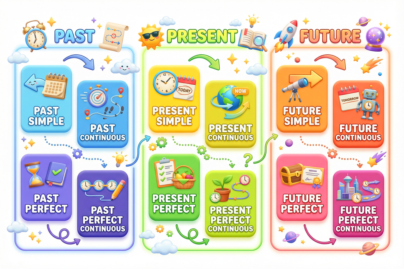 בעברית החיים שלנו מאוד פשוטים: עבר, הווה, עתיד. באנגלית לעומת זאת – יש 12 זמנים עיקריים! למה צריך לסבך? כי הזמנים באנגלית לא רק אומרים לנו מתי משהו קרה, אלא גם איך הוא קרה.