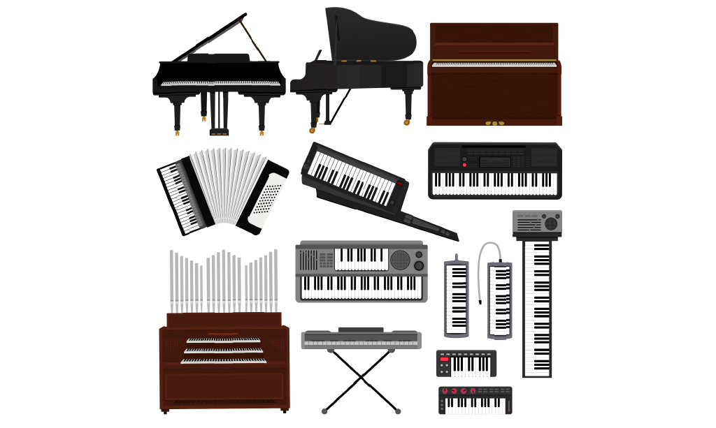 | פסנתר | אחד מכלי הקלידים המוכרים ביותר. באמצעות 88 קלידיו ובשליטה של שלוש דוושות רגליים, ניתן להפיק צלילים במגוון סגנונות מוזיקה כולל קלאסית, ג'אז, פופ ורוק. | Piano |
