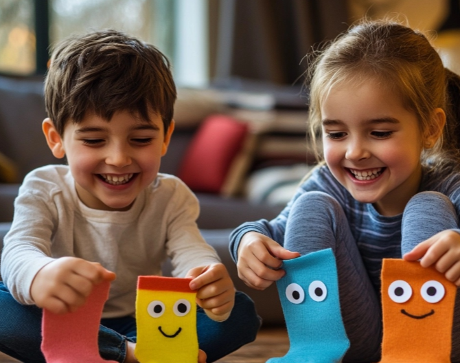 - הכנת בובות: גרב ישן, כפתורים, וניירות צבעוניים – והילד יוצר דמות משלו. ההשפעה רגשית ומיידית.
