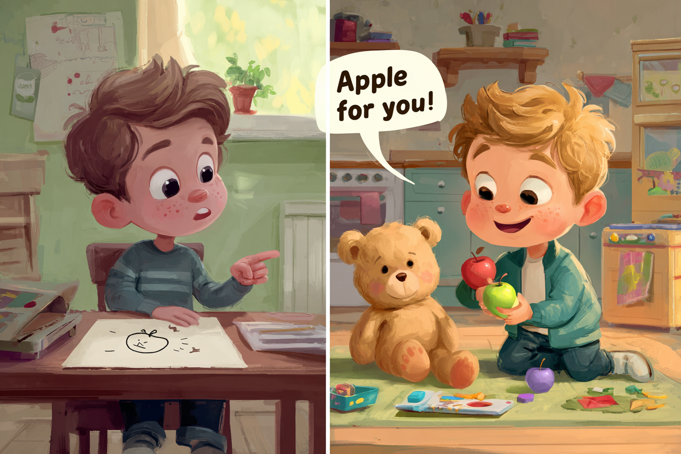 תמונות יכולות ללמד ילד שפרי אדום ועגול נקרא "תפוח". אבל משחק במטבח דמיון, שבו "חותכים" תפוח, "מגישים" אותו לבובה ו"אוכלים" אותו בהנאה, מלמד הרבה יותר. הוא מלמד את המילה "תפוח" בתוך רשת שלמה של משמעויות: הוא קושר את המילה לפעולות (לחתוך, לאכול), לתכונות (אדום, טעים, עגול), ולקונטקסט חברתי (להגיש, לחלוק).