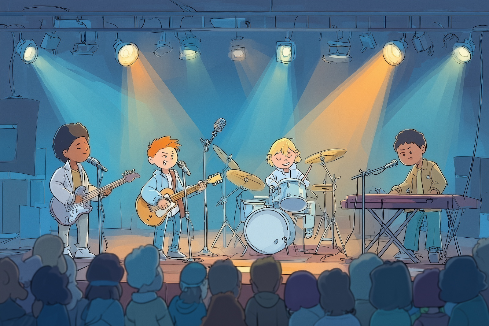 - The band is playing on stage | הלהקה מנגנת על הבמה.