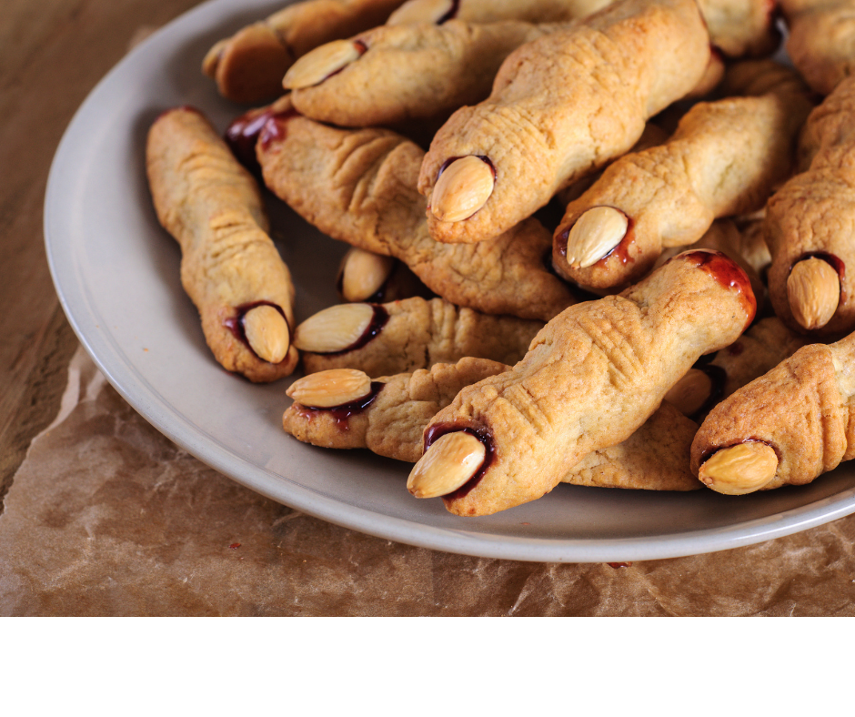 Preparare dei dolcetti a tema è un’altra attività di Halloween per i bambini che ti consigliamo. La ricetta che trovi qui è tra le preferite dei bambini, semplice ma molto scenografica: biscotti a forma di dita di strega mozzate. Sono semplici da fare e puoi prepararli insieme ai bambini. Non c’è bisogno di una speciale ricetta per la pasta dei biscotti, puoi usare il tuo preferito o preparare una pasta frolla. L’importante è dare ai biscotti la forma di dita e fare dei piccoli tagli in corrispondenza di quelle che sarebbero le nocche delle dita, perché sembrino davvero delle dita. Facendo un po’ di pressione, metti una mandorla sbucciata su ogni biscotto per dare l’impressione di un’unghia e cuoci in forno. Il tocco finale è la marmellata di fragole intorno all’unghia e alla fine del dito, che sembrerà sangue.