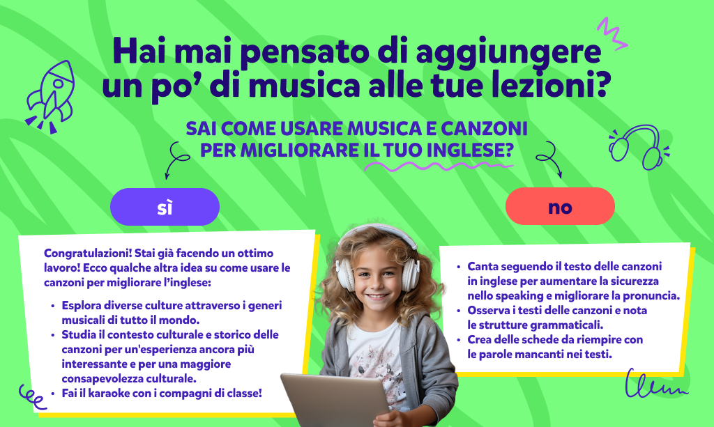 La musica rende l’apprendimento dell’inglese divertente, e aiuta anche a comprendere diverse culture e idee da tutto il mondo. Attraverso la musica, non solo migliori le tue abilità linguistiche, ma acquisisci anche una visione delle diverse culture e tradizioni.