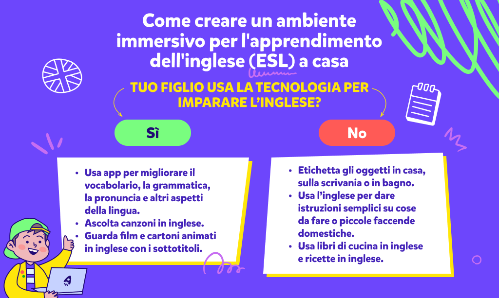 Coinvolgimento della famiglia: incoraggia tutta la famiglia a conversare in inglese. Parlate del vostro quotidiano, raccontate storie o giocate a giochi linguistici tutti insieme per creare opportunità di praticare l’inglese in un ambiente familiare e incoraggiante.