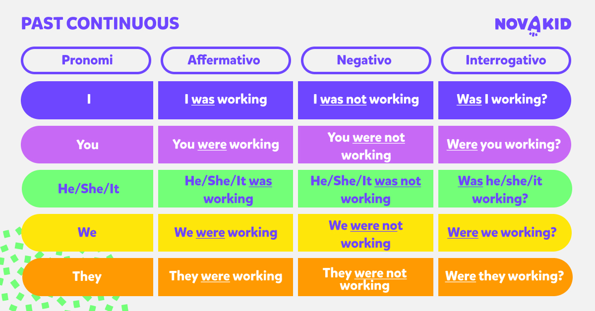 La regola è semplice: il Past Continuous si forma con il verbo to be al passato (was o were) seguito dal verbo principale con la desinenza -ing.
