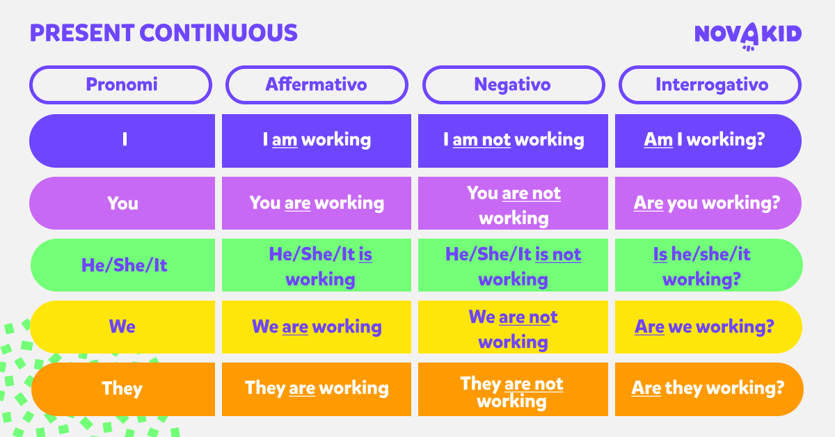 In questo articolo scopri quando si usa il Present continuous, come si forma, alcune frasi di esempio e molti esercizi online con risposta. Lo ha scritto per te Novakid, scuola online di inglese per bambini e ragazzi dai 4 ai 12 anni, presente in 50 paesi del mondo con insegnati anglofoni certificati e programmi conformi Qcer dall’ inglese per principianti fino al programma di inglese terza media.