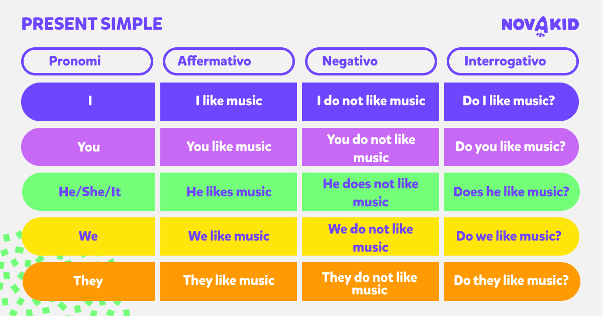 Per questo Novakid, la scuola di inglese per bambini presente online in 50 paesi del mondo ti ha preparato questo articolo. Ci troverai oltre a regole, tabelle e spiegazioni, anche molte Present Simple frasi di esempio, e il link a tantissimi esercizi inglese Present Simple adatti anche ai bambini.