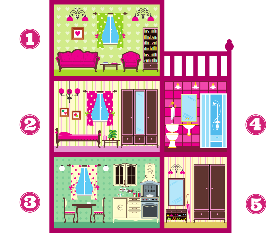 Per iniziare a imparare le stanze della casa in inglese puoi iniziare da questa immagine. Semplice e colorata, è perfetta per i bambini che frequentano un corso di inglese per principianti perché contiene le principali stanze della casa. Basta imparare queste cinque parti della casa per poter descrivere il proprio ambiente quotidiano.