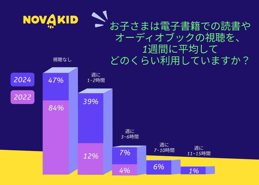 「お子様は読書をするために、1週間に平均してどのくらいの時間、コンピューターやタブレット、スマートフォンの画面を見ていますか?」(n=200)という質問をしたところ、53%の保護者が「1時間以上視聴している」と回答しました。2022年ではこの割合は16%でしたので、電子書籍やオーディオブックを利用する子どもが増えていることが分かります。