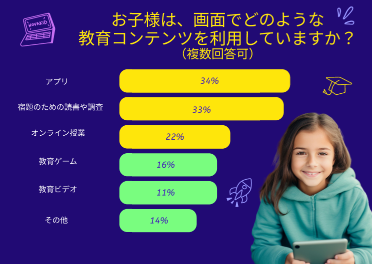 「お子様は、画面でどのような教育コンテンツを利用していますか?」(n=200)という質問に対し、34%が「アプリの利用」、33%が「宿題のための読書や調査」、22%が「オンライン授業」と回答しました。