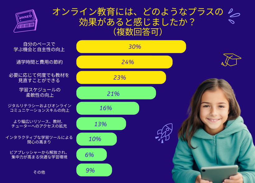 - オンライン教育のメリットに関して、1位は「自分のペースで学ぶ機会と自主性の向上」(30%)、2位は「通学時間と費用の節約」(24%)、3位は「必要に応じて何度でも教材を見直すことができる」(23%)