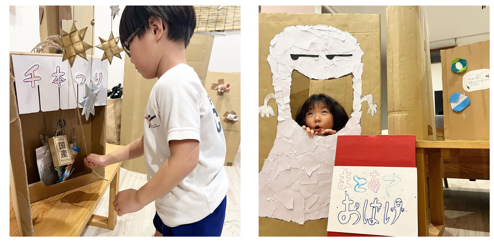 セミグランプリ1組目は小学生のご兄妹で制作した「手作りおうち縁日」が選ばれました。ダンボールやトイレットペーパーの芯、家にある空き箱などを使って、縁日の遊びを作ってくれました。実際に遊べるゲーム性のある作品は作った後も楽しめますね。