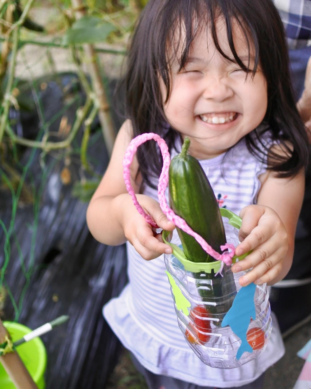 セミグランプリ2組目はペットボトルで作った「野菜の収穫バッグ」が選ばれました。「キュウリは数字の1?アルファベットのIみたいにまっすぐー!大きいね」と英語を絡めながらお庭のお野菜を収穫したそうです。おめでとうございます!
