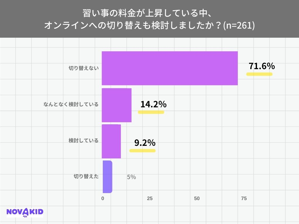また、習い事の値上がりを受け、スイミングなど物理的に切り替えられない習い事の他、塾や英会話、プログラミングなどのオンラインのサービスを検討している人が全体の3割となる結果でした。