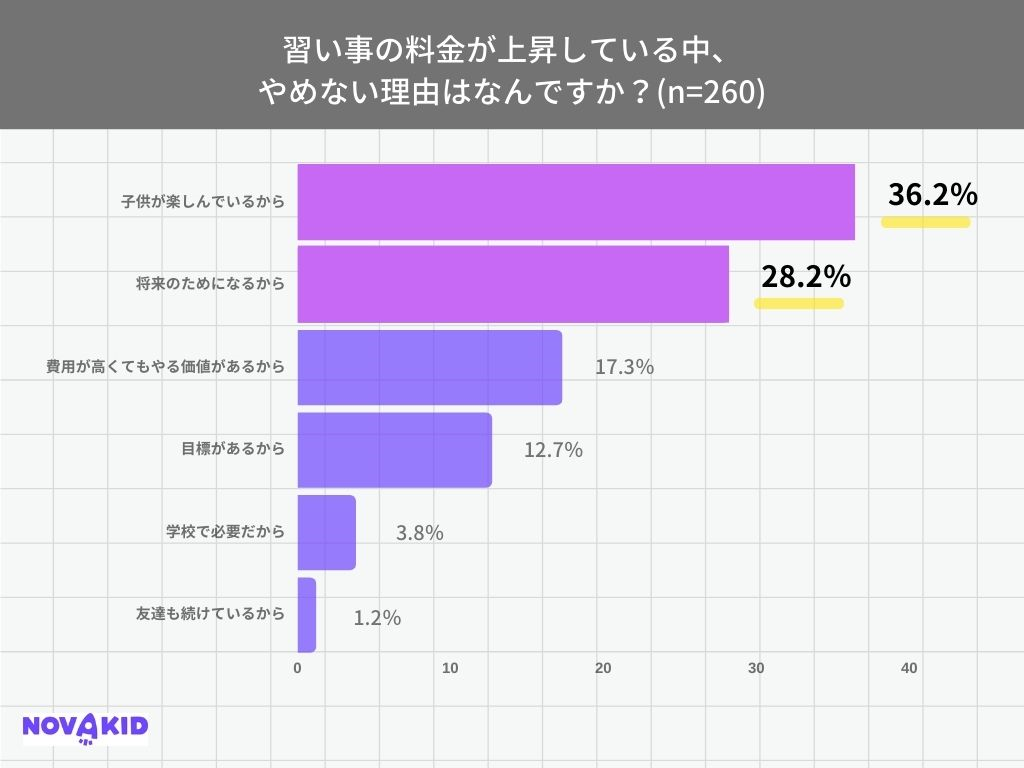 「習い事の料金が上昇している中、やめない理由はなんですか?」(n=260)という質問に対して、「子どもが楽しんでいるから」という回答が36.2%と最も多く、次いで「将来のためになるから」という回答は28.2%となりました。値上がりしても子どものやりたいことをさせたいという意向と、将来のために続けたいという傾向が表れました。
