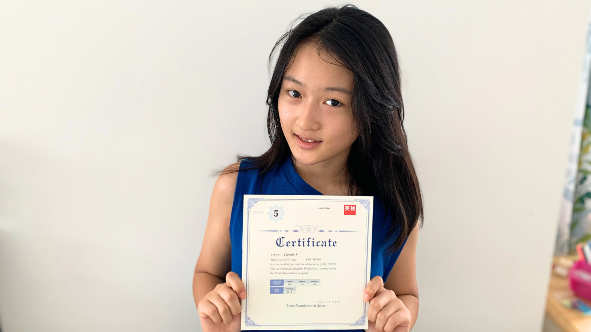mocomocoちゃんは日本にいて、自分がどのぐらいの英語力のレベルなのかを測り把握するには良いと、英検受験に挑戦して良かったと答えてくれました。また、受験を通じて論文などを書くには必要だなと感じたそうです。