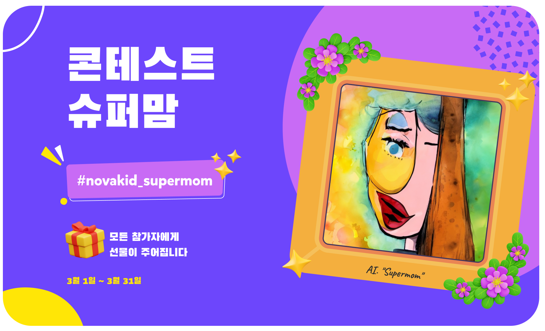 아이가 그린 슈퍼맘 사진으로 노바키드 무료 영어 수업 이용권과 학생 계정의 별을 받으세요!