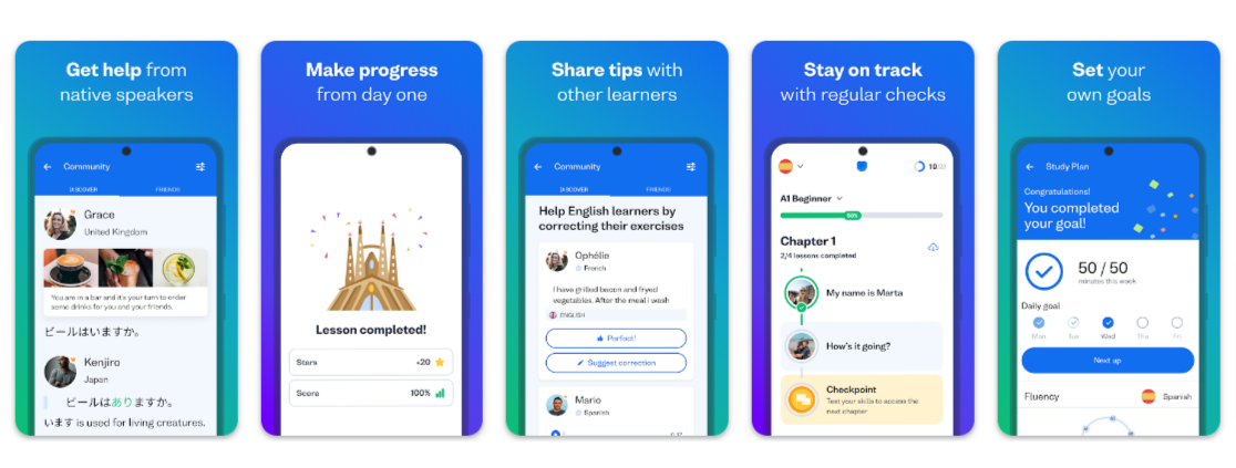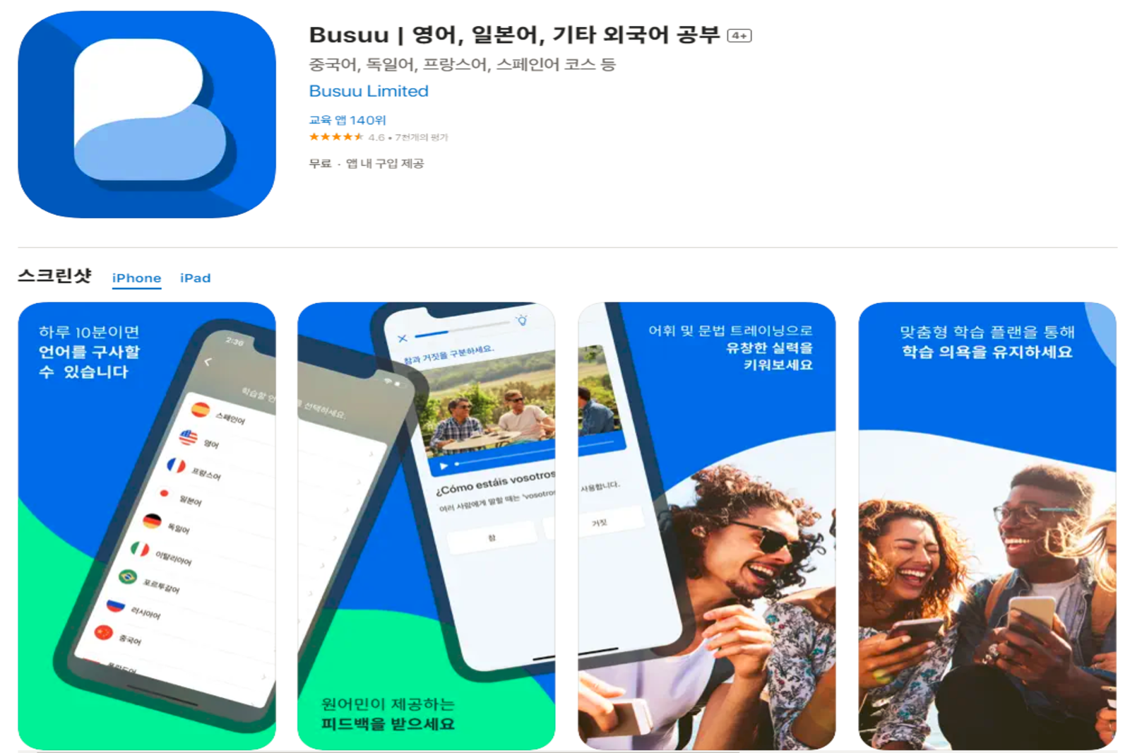 Busuu는 소셜 미디어의 기능과 외국어 공부 앱의 기능이 결합된 서비스를 제공하고 있습니다. 어느 정도 영어의 입문 코스를 지났다고 생각하신다면 Busuu에서는 주제별 언어의 형태와 실용적인 구절, 표현 같은 일상 언어를 배우실 수 있는 학습 앱입니다.  특히 언어의 뉘앙스나 문화적 맥락을 배울 수 있고, 최신 이슈에 대해서도 업로드가 잘 되어 있다는 장점과 원어민에게 내가 공부한 내용에 대한 의견을 들어볼 수 있다는 장점도 있습니다.