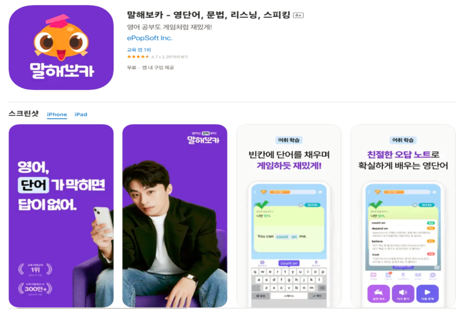 말해보카는 수준에 맞는 영어 학습을 지향합니다. 앱을 시작할 때 테스트를 통해 본인의 수준을 나누고 그에 맞는 영어 학습을 시작할 수 있습니다. 말해보카 역시 게임이나 퀴즈를 통한 접근성을 가지기 때문에 초기 영어에 대한 편안한 마음가짐을 형성해 줍니다. 말해보카는 특히 단어나 어휘 학습에 강점을 가지는 영어 학습 앱입니다. 특히 이용자들이 가장 선호하는 것은 말해보카에서 제공하는 오답노트를 통한 복습 시스템인데, 이를 통한 단어와 어휘 암기가 가장 호평을 받고 있습니다. 무료 콘텐츠와 유료 콘텐츠가 함께 존재하며, 아이들과 어른들 모두가 함께 이용하고 있는 영어 앱입니다.