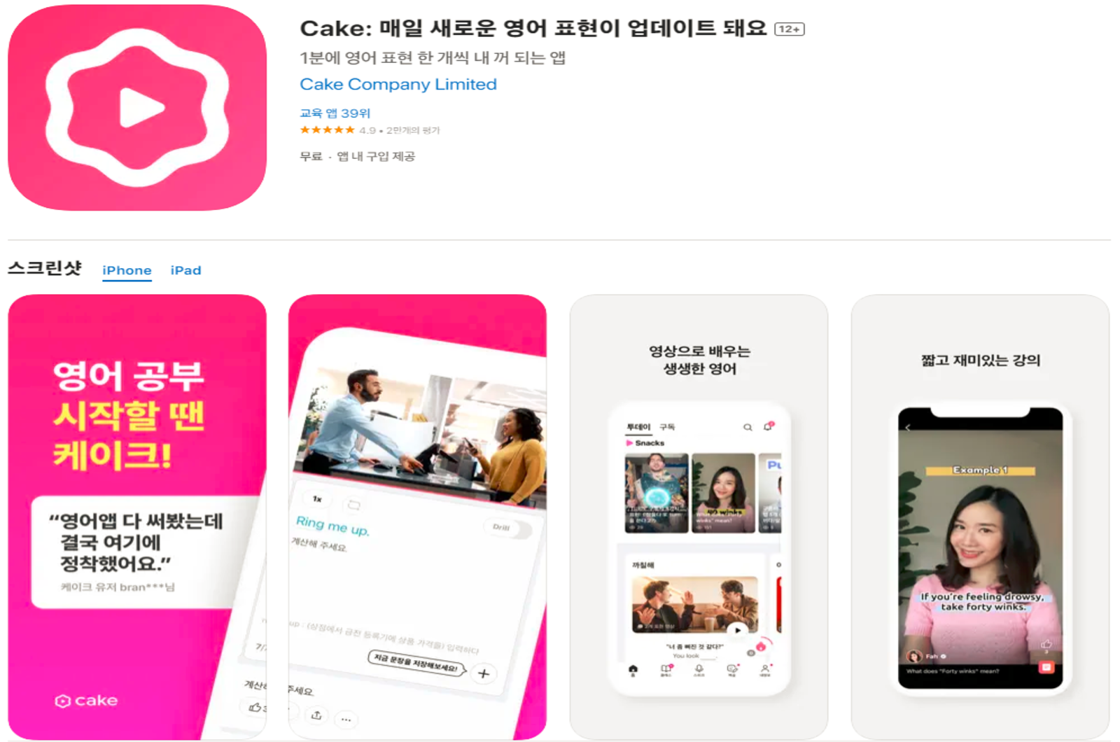Cake는 무료 영어 공부 앱으로, 일상생활에서 바로 쓸 수 있는 영어 학습을 돕습니다. 실제로 영화나 드라마, Youtube에서 사용되고 있는 영어, 원어민의 말투와 억양을 배울 수 있습니다. 영상을 대사 단위로 듣고, 말하기와 듣기, 발음 연습까지 가능한 영어 학습 앱입니다. 여기에 재미있는 강의와 퀴즈, 데일리 표현, 스피킹 등 다양한 영어 학습을 도울 수 있는 콘텐츠 또한 제공하고 있습니다.