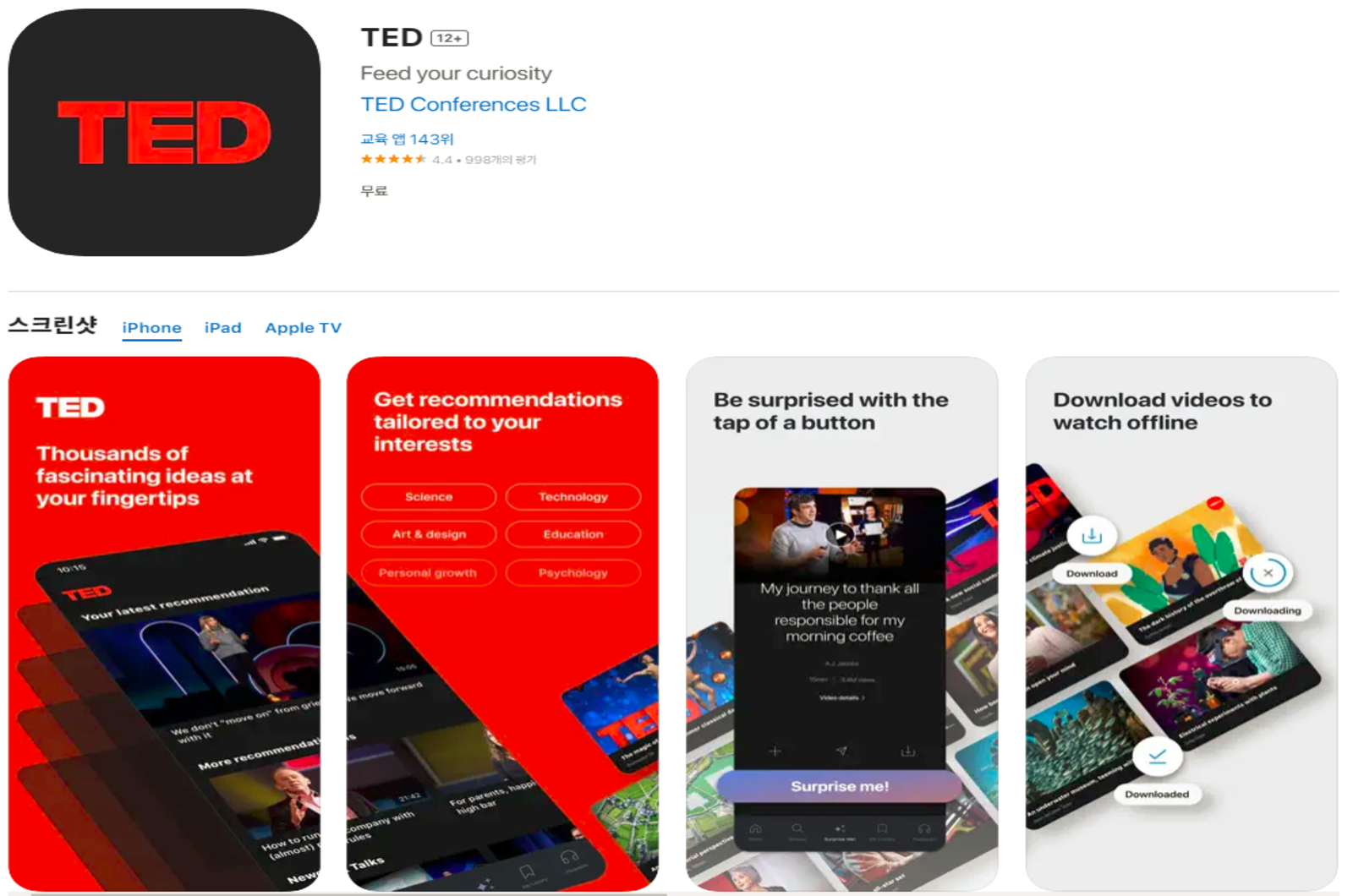 웹이나 팟캐스트 등에서도 이미 TED는 들어보신 분들이 많으실 것 같습니다. TED 앱은 무료로 전문가의 강연을 들을 수 있는 영어 앱입니다. 세계 여러 나라와 분야에서 활동을 하고 있는 유명 인사들과 전문가들의 강연을 무료로 보실 수 있습니다. 훨씬 더 격식 있고, 고급 어휘를 배우시고 싶으시다면 TED 강의를 들어보시는 것이 도움이 됩니다. 덤으로 다양한 전문 지식과 이슈들을 배울 수 있다는 장점도 있습니다. 영어 자막을 지원하고 있으니 독해 공부도 함께 하실 수 있습니다.