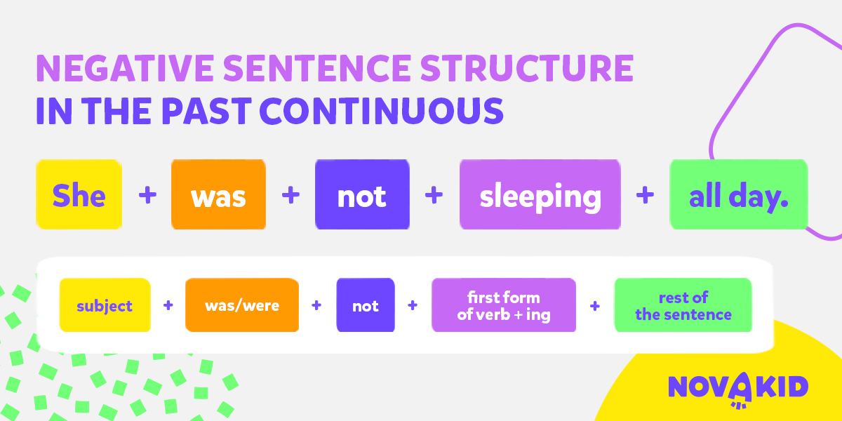 W czasie Past Continuous tworzymy zdania przeczące poprzez dodanie „not” po „was” lub „were”. Do zbudowania przeczenia w czasie Past Continuous zastosujemy schemat: